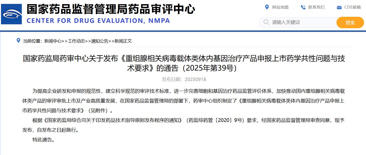 國家藥監(jiān)局藥審中心關(guān)于發(fā)布《重組腺相關(guān)病毒載體類體內(nèi)基因治療產(chǎn)品申報(bào)上市藥學(xué)共性問題與技術(shù)要求》的通告(2025年第39號(hào))