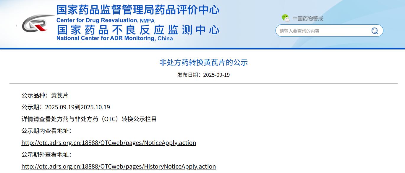 非處方藥轉(zhuǎn)換黃芪片的公示