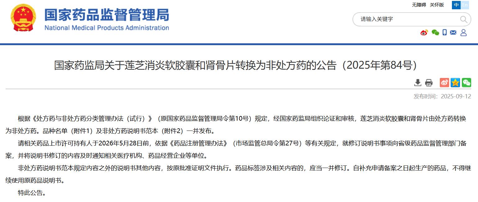 國家藥監(jiān)局關(guān)于蓮芝消炎軟膠囊和腎骨片轉(zhuǎn)換為非處方藥的公告(2025年第84號(hào))