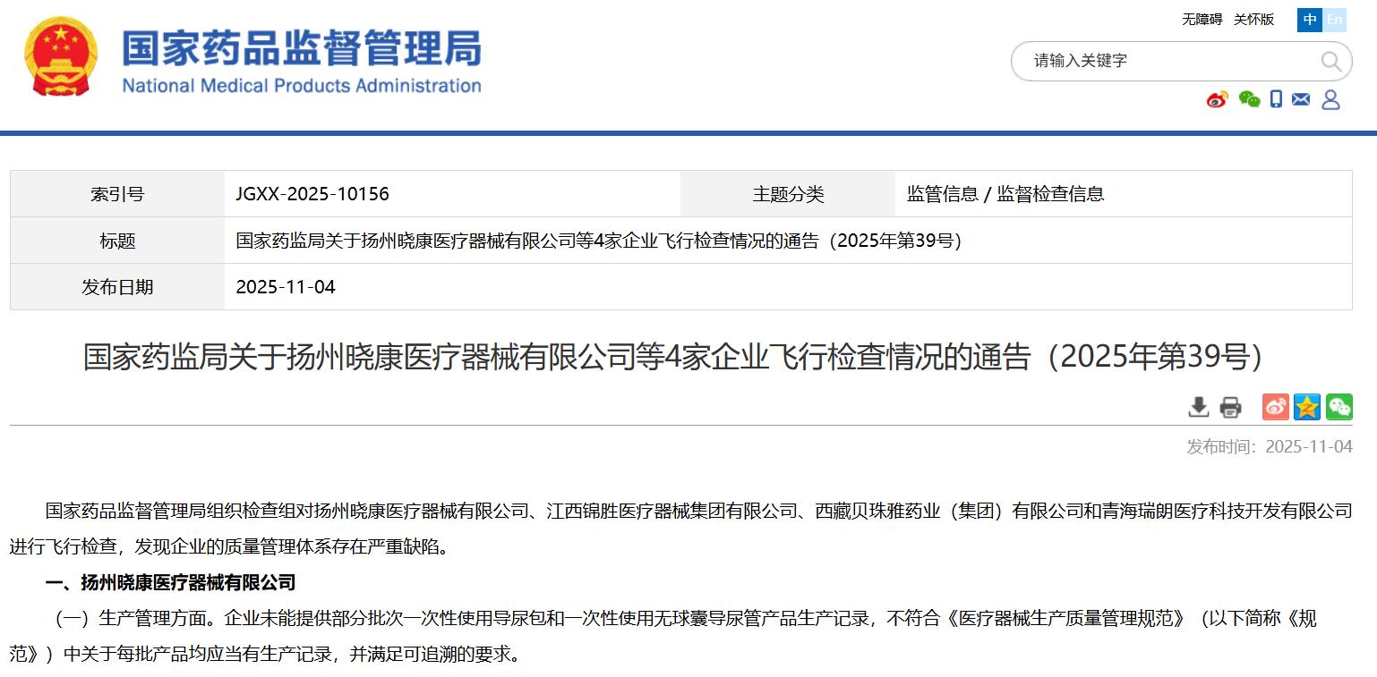國家藥監(jiān)局關(guān)于揚(yáng)州曉康醫(yī)療器械有限公司等4家企業(yè)飛行檢查情況的通告(2025年第39號)