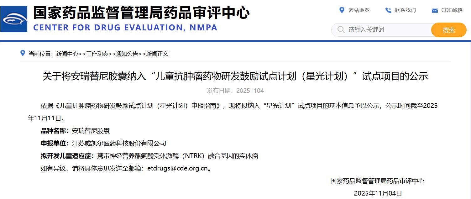關(guān)于將安瑞替尼膠囊納入“兒童抗腫瘤藥物研發(fā)鼓勵(lì)試點(diǎn)計(jì)劃(星光計(jì)劃)”試點(diǎn)項(xiàng)目的公示