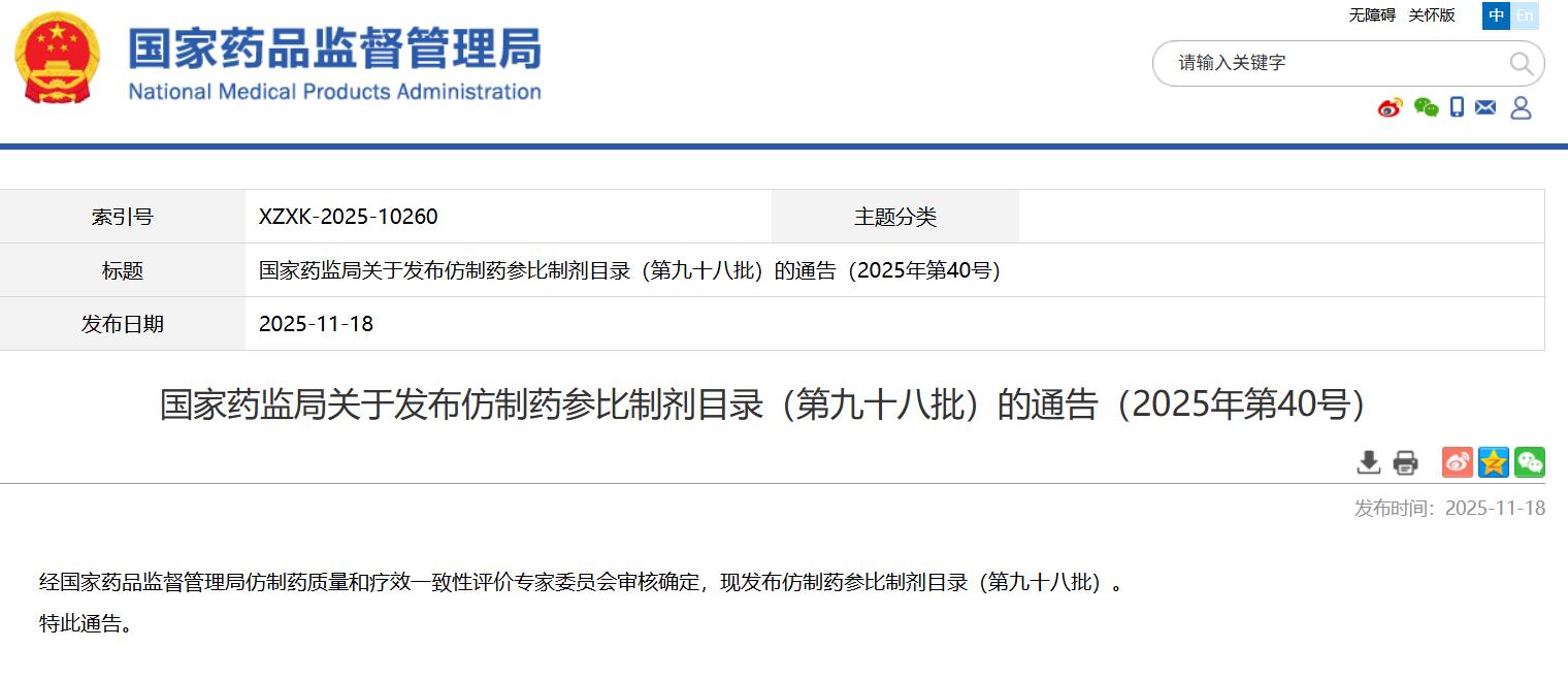 國(guó)家藥監(jiān)局關(guān)于發(fā)布仿制藥參比制劑目錄(第九十八批)的通告(2025年第40號(hào))