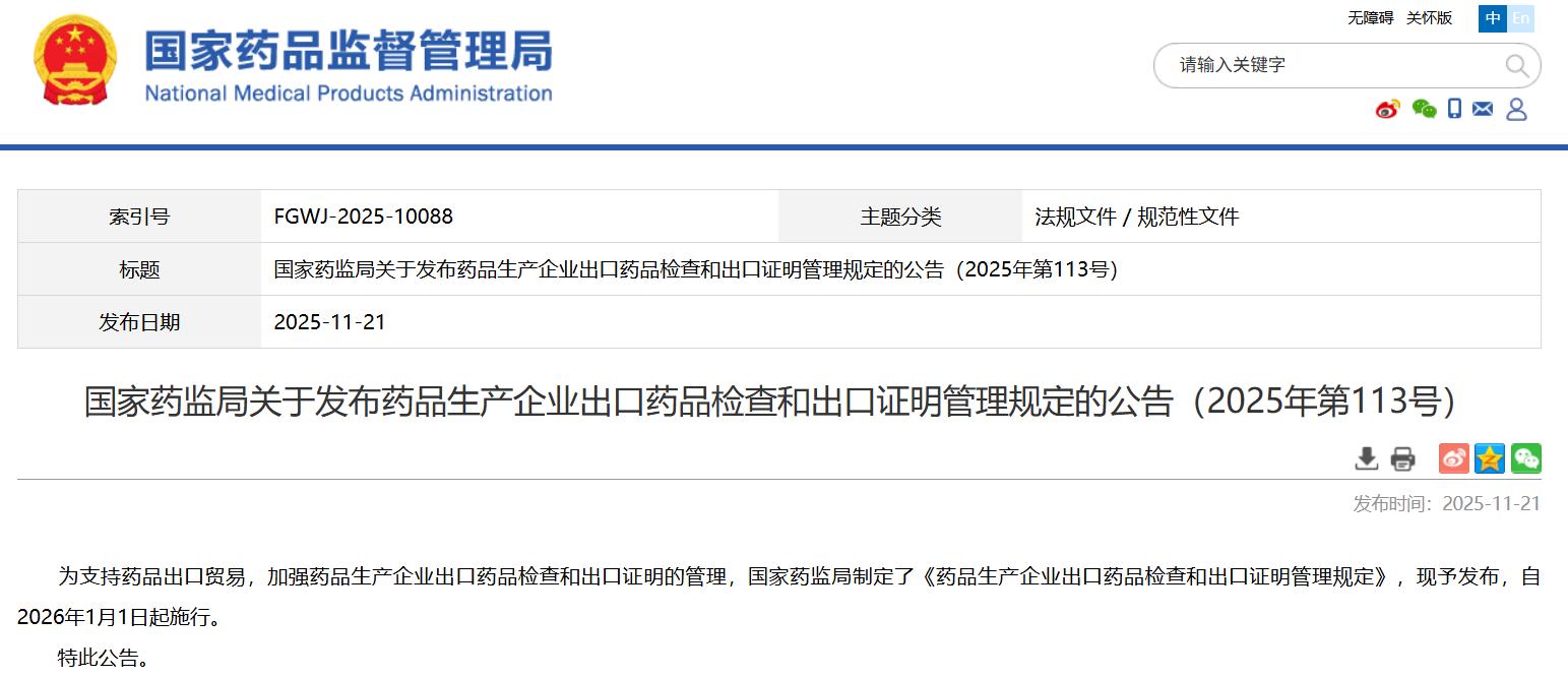 國(guó)家藥監(jiān)局關(guān)于發(fā)布藥品生產(chǎn)企業(yè)出口藥品檢查和出口證明管理規(guī)定的公告(2025年第113號(hào))