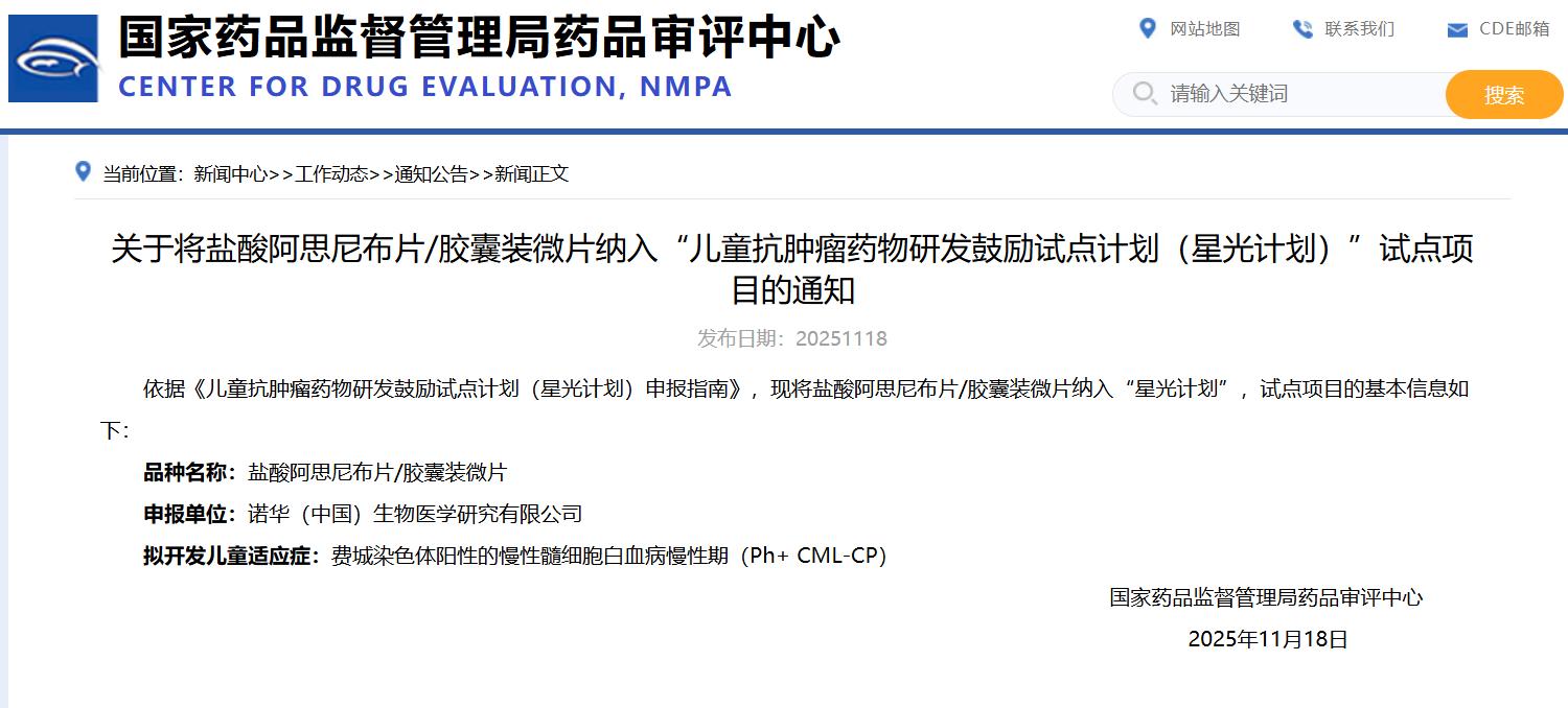關(guān)于將鹽酸阿思尼布片/膠囊裝微片納入“兒童抗腫瘤藥物研發(fā)鼓勵(lì)試點(diǎn)計(jì)劃(星光計(jì)劃)”試點(diǎn)項(xiàng)目的通知