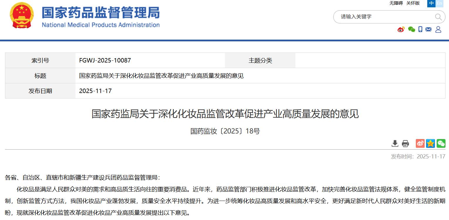 國(guó)家藥監(jiān)局關(guān)于深化化妝品監(jiān)管改革促進(jìn)產(chǎn)業(yè)高質(zhì)量發(fā)展的意見(jiàn)