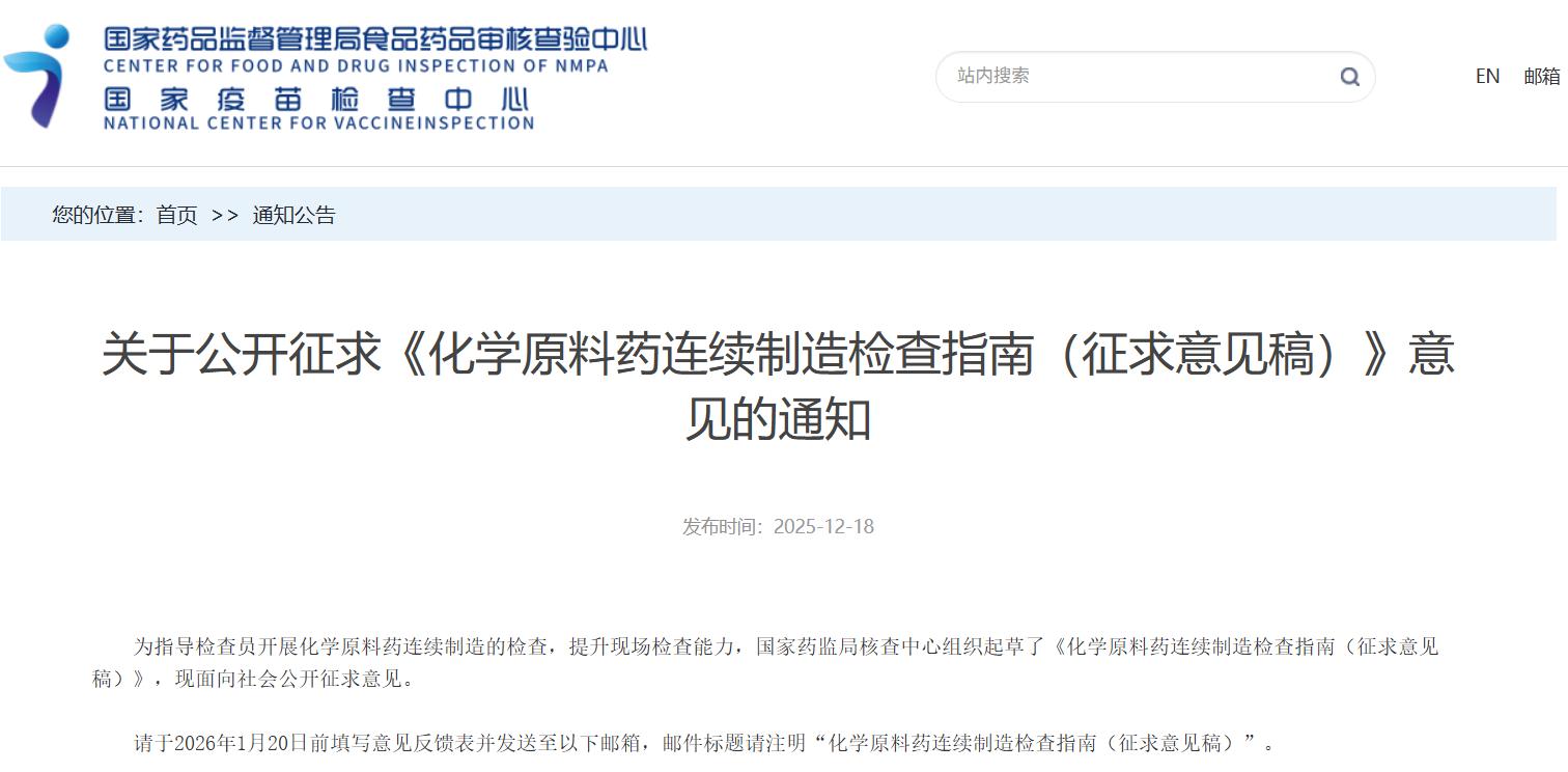 關(guān)于公開征求《化學(xué)原料藥連續(xù)制造檢查指南(征求意見稿)》意見的通知