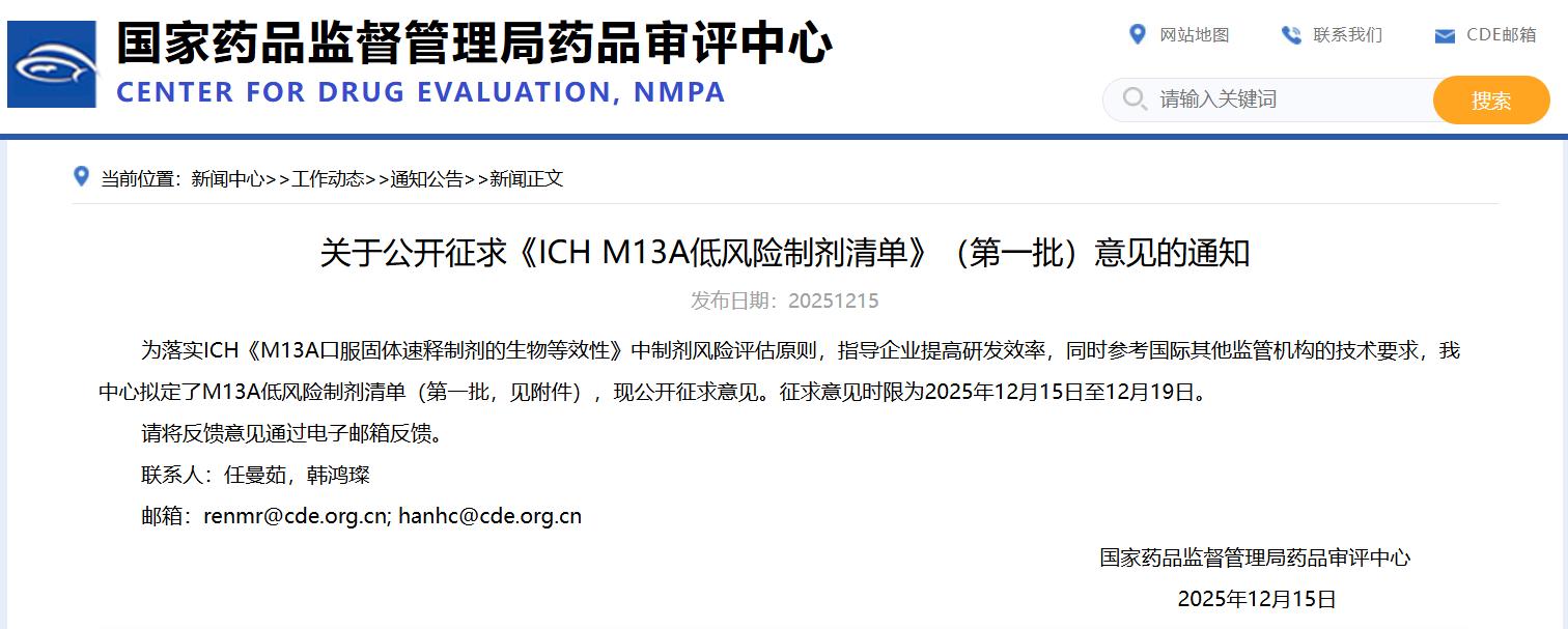 關(guān)于公開征求《ICH M13A低風(fēng)險(xiǎn)制劑清單》(第一批)意見的通知