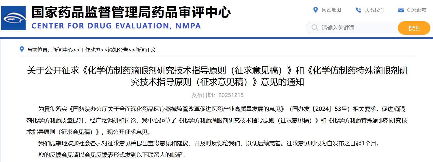 關(guān)于公開征求《化學(xué)仿制藥滴眼劑研究技術(shù)指導(dǎo)原則(征求意見稿)》和《化學(xué)仿制藥特殊滴眼劑研究技術(shù)指導(dǎo)原則(征求意見稿)》意見的通知