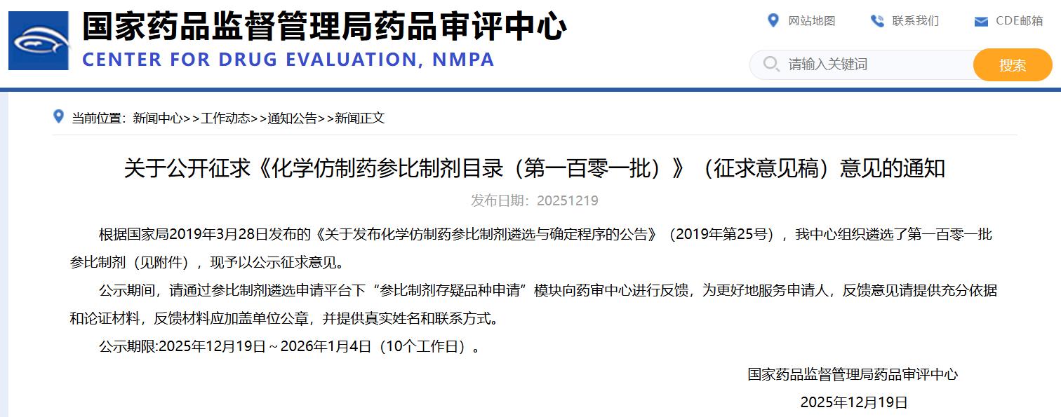關(guān)于公開征求《化學(xué)仿制藥參比制劑目錄(第一百零一批)》(征求意見稿)意見的通知