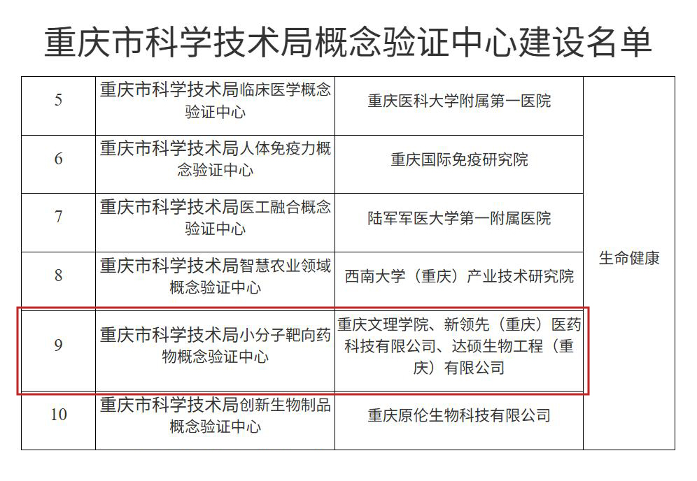 喜報 | 新領(lǐng)先(重慶)醫(yī)藥科技成功入選重慶市科學(xué)技術(shù)局概念驗證中心建設(shè)依托單位