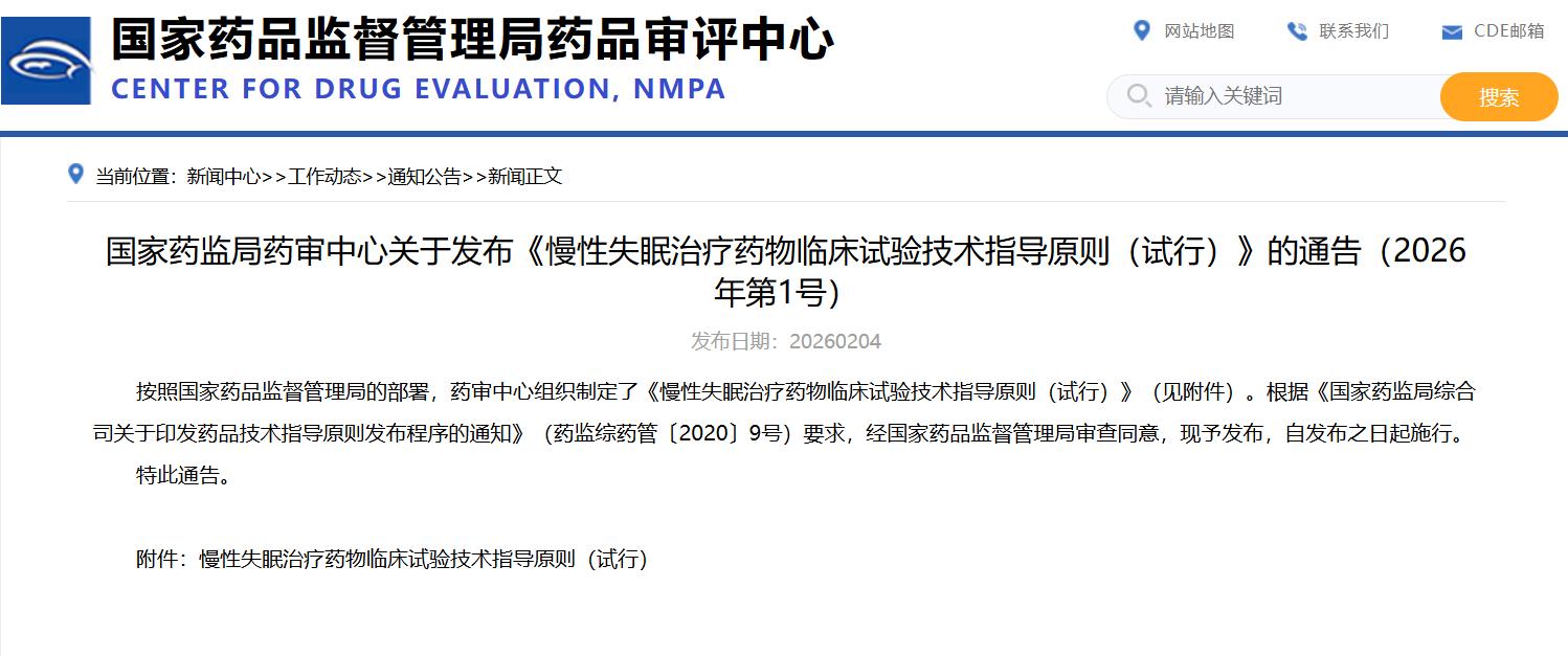 國(guó)家藥監(jiān)局藥審中心關(guān)于發(fā)布《慢性失眠治療藥物臨床試驗(yàn)技術(shù)指導(dǎo)原則(試行)》的通告(2026年第1號(hào))