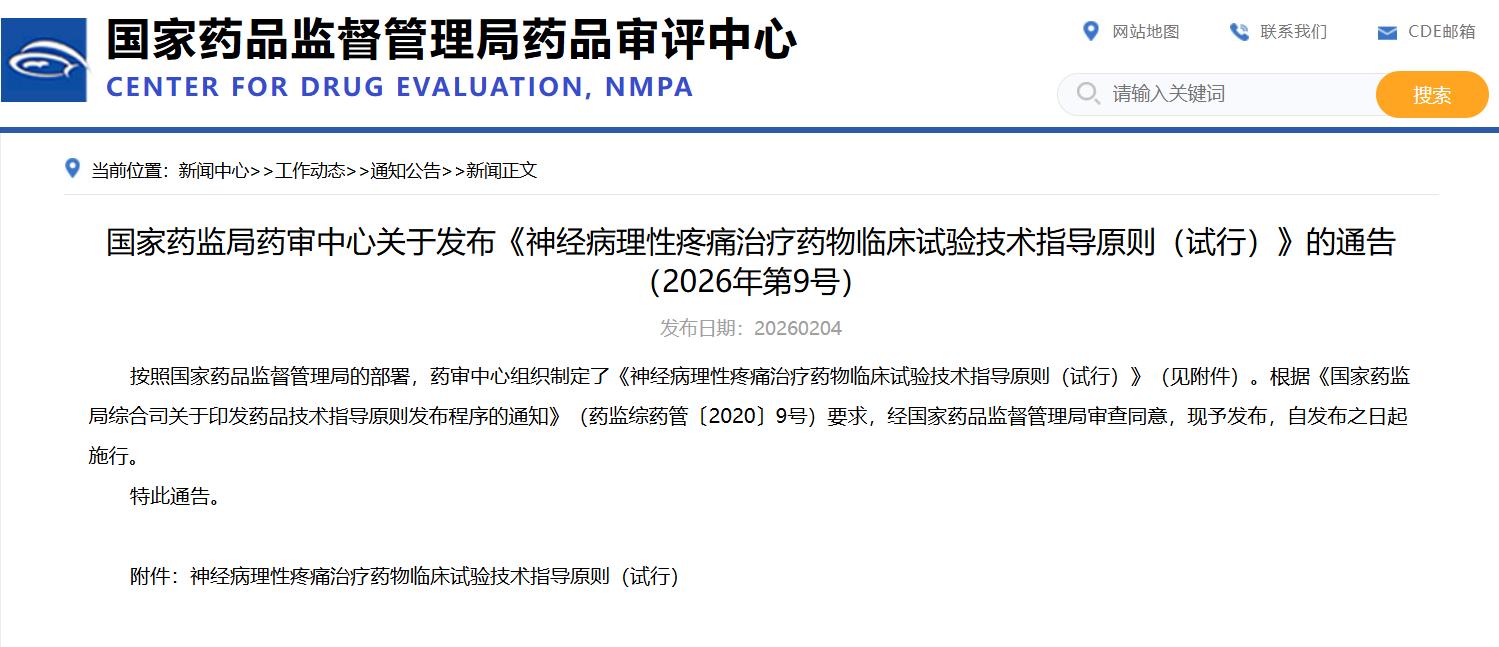 國(guó)家藥監(jiān)局藥審中心關(guān)于發(fā)布《神經(jīng)病理性疼痛治療藥物臨床試驗(yàn)技術(shù)指導(dǎo)原則(試行)》的通告(2026年第9號(hào))