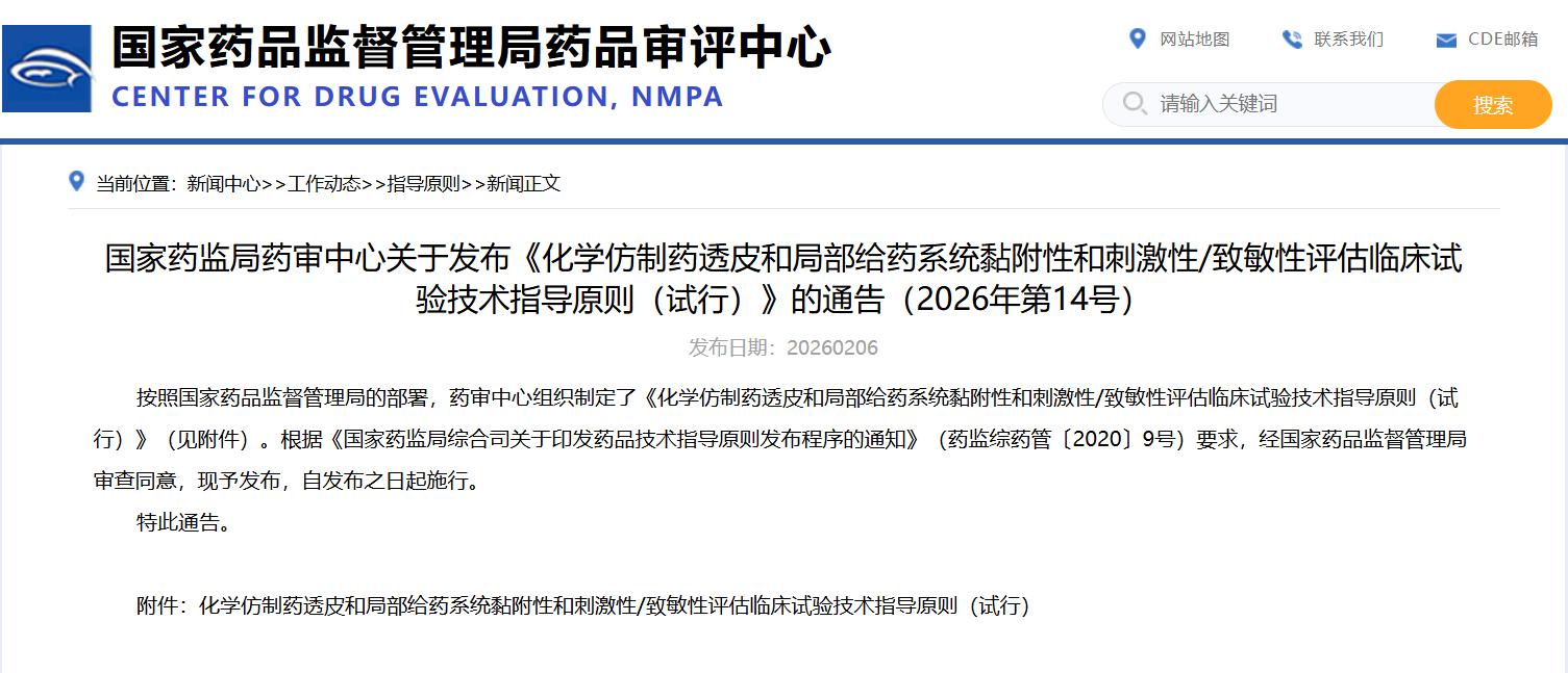 國(guó)家藥監(jiān)局藥審中心關(guān)于發(fā)布《化學(xué)仿制藥透皮和局部給藥系統(tǒng)黏附性和刺激性/致敏性評(píng)估臨床試驗(yàn)技術(shù)指導(dǎo)原則(試行)》的通告(2026年第14號(hào))