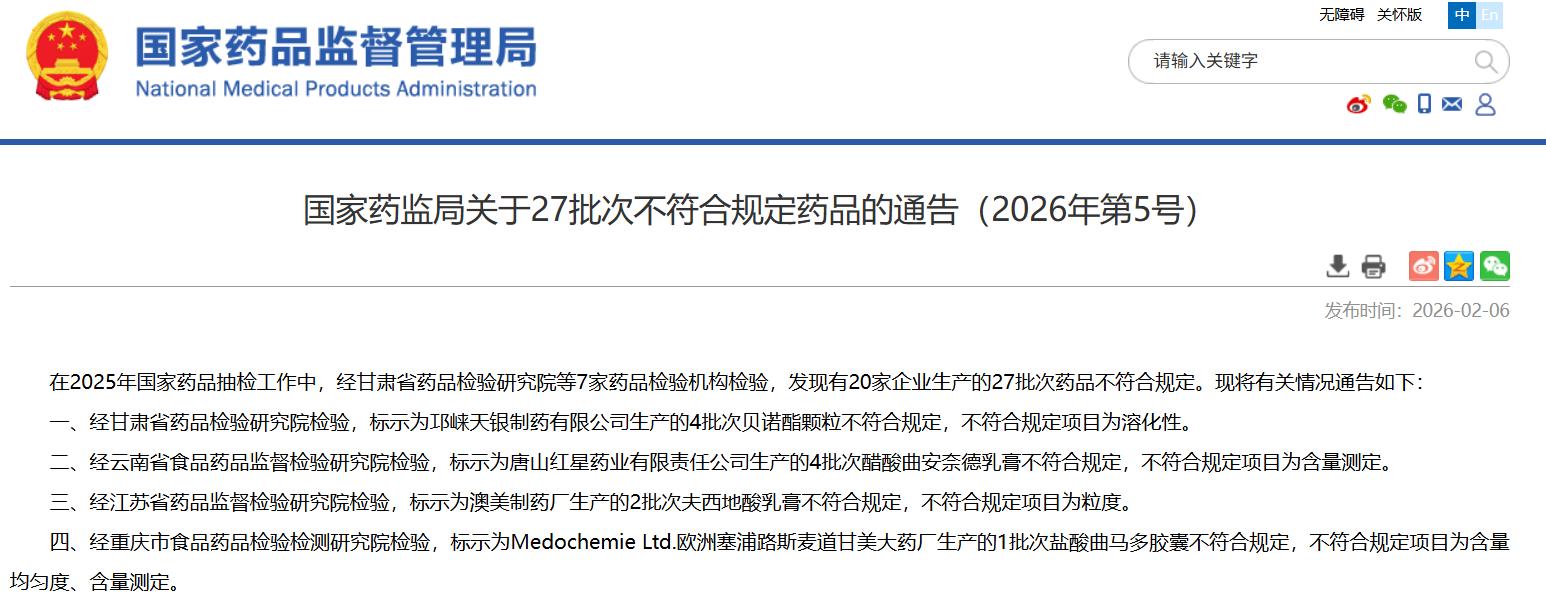 國(guó)家藥監(jiān)局關(guān)于27批次不符合規(guī)定藥品的通告(2026年第5號(hào))