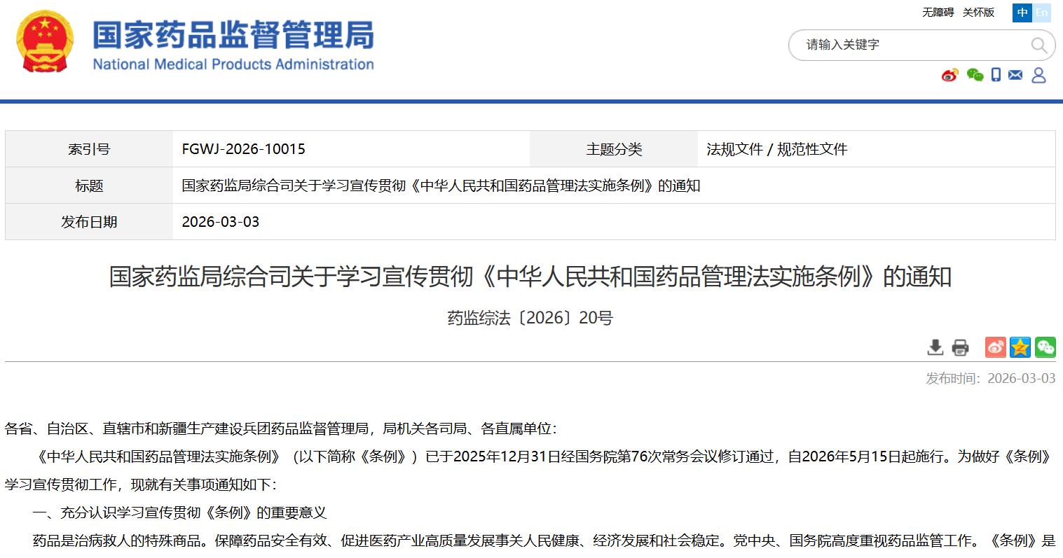 國家藥監(jiān)局綜合司關(guān)于學(xué)習(xí)宣傳貫徹《中華人民共和國藥品管理法實(shí)施條例》的通知
