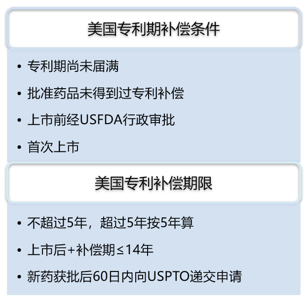(1)美國(guó)最先提出“藥品專(zhuān)利期補(bǔ)償”的概念。1984年的Hatch-Waxman法案規(guī)定:1、美國(guó)藥品專(zhuān)利到期最長(zhǎng)可延長(zhǎng)5年,但專(zhuān)利補(bǔ)償期和上市后剩余的專(zhuān)利期累計(jì)不能超過(guò)14年;2、一種藥物只能延長(zhǎng)一個(gè)專(zhuān)利的保護(hù)期。
