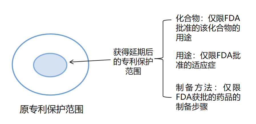 • (1)FDA批準(zhǔn)的藥品專(zhuān)利有效期延長(zhǎng)后的保護(hù)范圍小于原專(zhuān)利要求保護(hù)的范圍,如下圖所示:
