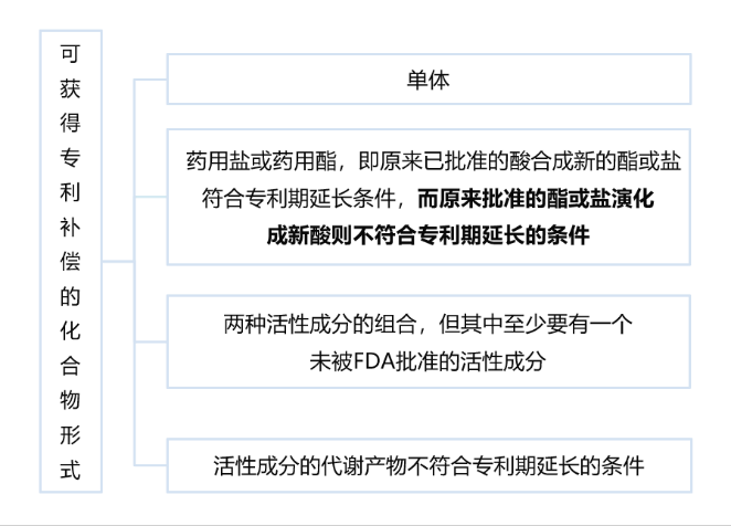 • (2)FDA對(duì)于可獲得專(zhuān)利期延長(zhǎng)的藥品專(zhuān)利中的活性成分有特殊限定,如下所示: