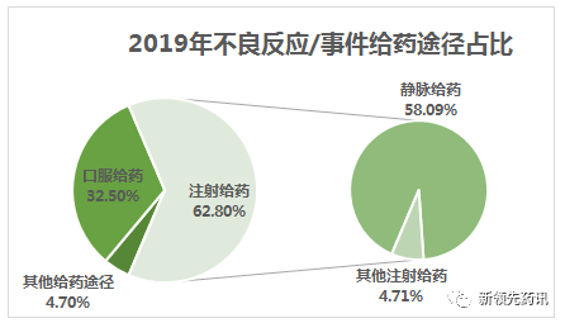 由于歷史因素,國產(chǎn)注射劑的安全性和有效性與原研制劑之間仍存在差異。根據(jù)《國家藥品不良反應(yīng)監(jiān)測年度報告(2019)》統(tǒng)計顯示,在2019年不良反應(yīng)/事件報告中,注射劑占62.8%(其中靜脈給藥58.09%,其他注射給藥4.71%),口服給藥占32.5%,其他給藥途徑占4.7%。
