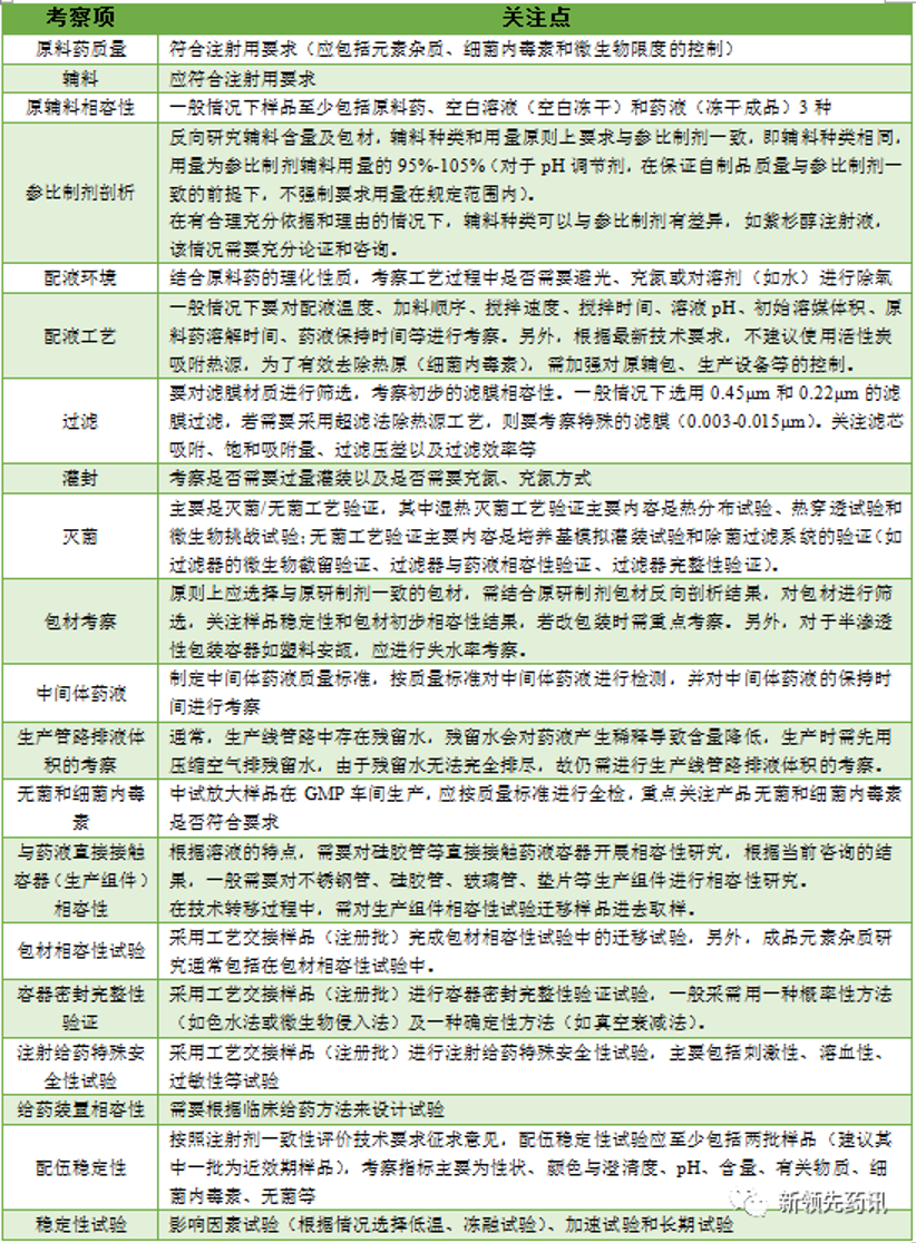 對于普通注射劑的仿制,不同于口服固體制劑,無需進(jìn)行體外溶出擬合,但對于質(zhì)量要求更為嚴(yán)格。需以輔料組成(Q1)相同,用量(Q2)相同(仿制藥輔料用量為參比制劑相應(yīng)輔料用量的95%~105%)為前提,對原輔包的質(zhì)量、滅菌工藝、配伍穩(wěn)定性、安全性及相容性等進(jìn)行嚴(yán)格的考察。