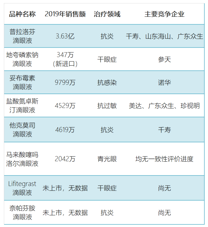 除玻璃酸鈉外,其他關(guān)注度較高的產(chǎn)品有聚乙烯醇、奧洛他定、莫西沙星、左氧氟沙星、曲伏前列素、拉坦前列素、他氟前列素和硫酸阿托品。詳細(xì)市場和競爭情況如下: