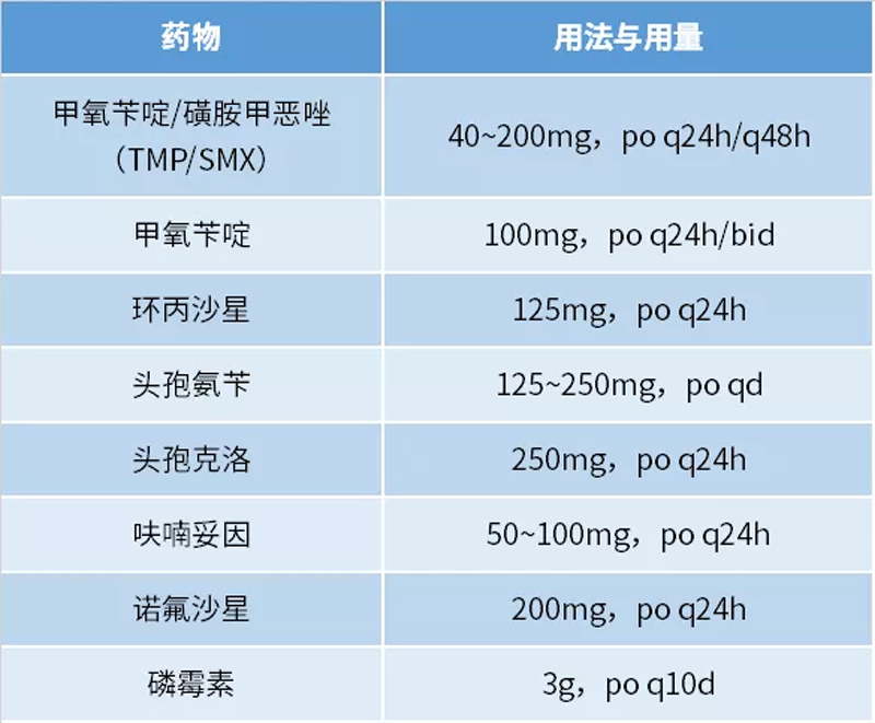 一般常用治療尿路感染的抗生素,如下列表格中所示: