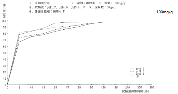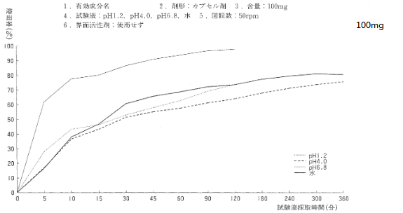 文獻(xiàn)信息:日本橙皮書中,檢索到該膠囊100mg各介質(zhì)中的溶出曲線如下: