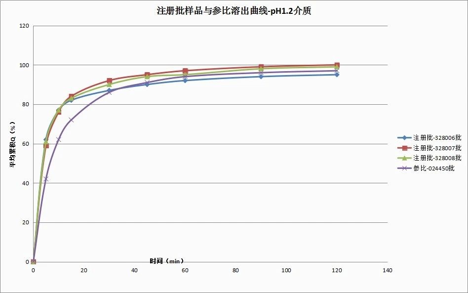 本品種仿制藥開發(fā)的過(guò)程,經(jīng)過(guò)逐級(jí)放大,工藝驗(yàn)證三批樣品在pH1.2介質(zhì)中的溶出略快于BE批次的參比制劑,三批樣品與參比的相似因子均未達(dá)到50,曲線圖如下: