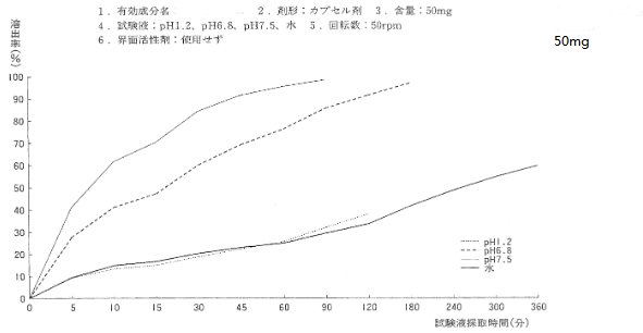 日本橙皮書中公布的本品原研膠囊劑50mg的體外溶出曲線如下:
