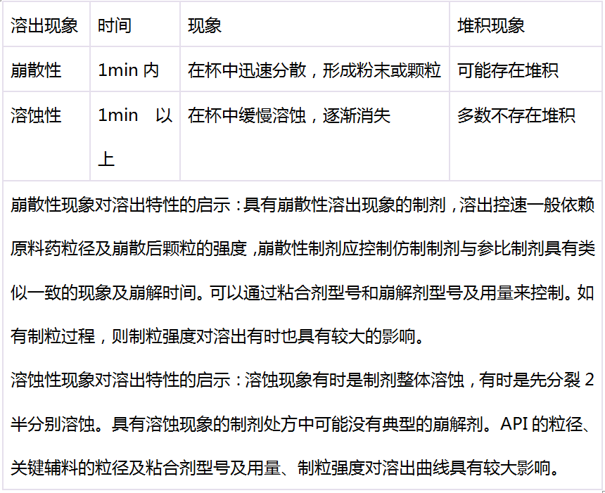 參比制劑溶出現(xiàn)象及溶出數(shù)據(jù)的解讀,在參比制劑溶出特性剖析時,首先應(yīng)重視溶出現(xiàn)象的觀察與思考,溶出現(xiàn)象大致分為兩類,崩散性與溶蝕性。包衣片應(yīng)關(guān)注包衣脫落時間,膠囊劑應(yīng)關(guān)注膠囊殼破裂時間,顆粒劑及干混懸劑應(yīng)關(guān)注顆粒分散狀態(tài),如顆粒加入溶出杯中是否有漂浮,是否有聚集 。