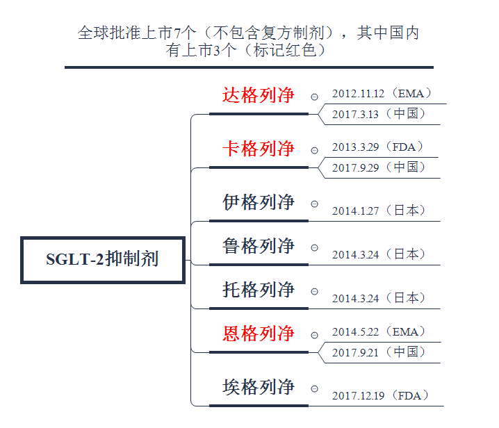 SGLT-2抑制劑是一種近年來新型口服降糖藥的后起之秀,目前全球共批準7個品種上市(不包含復方制劑),其中國內(nèi)上市3個,如下圖所示: