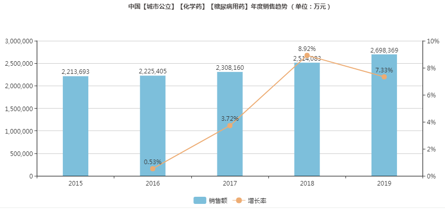糖尿病是全球普遍流行的慢性疾病之一,據(jù)統(tǒng)計,目前全球約有4.63億人患有糖尿病。我國糖尿病人數(shù)高達1.14億,患病率近年維持在11%左右。據(jù)米內(nèi)網(wǎng)統(tǒng)計數(shù)據(jù)顯示,2019年中國城市公立醫(yī)院終端糖尿病治療藥物市場規(guī)模約270億元(渠道格局占比47.19%),測算全國醫(yī)院市場規(guī)模高達572億元。