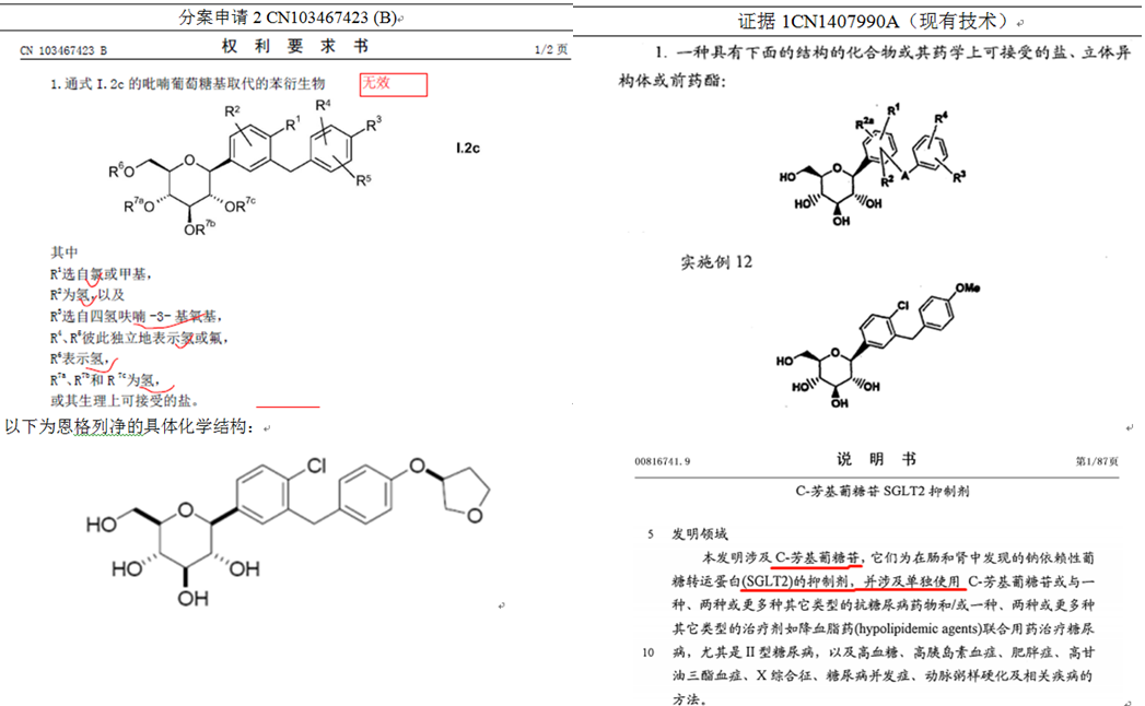 分案2(423B)無效基于的主要理由是不符合專利第22條第3款創(chuàng)造性的規(guī)定,采用的證據(jù)為CN1407990A,該專利中公開了一種具有SGLT-2抑制活性的式I結(jié)構(gòu)吡喃葡萄糖取代的苯衍生物,并且具體公開了實施例12的化合物。此外,證據(jù)1還公開了上述化合物為在腸和腎中的鈉依賴型葡萄糖轉(zhuǎn)運蛋白SGLT-2的抑制劑。
