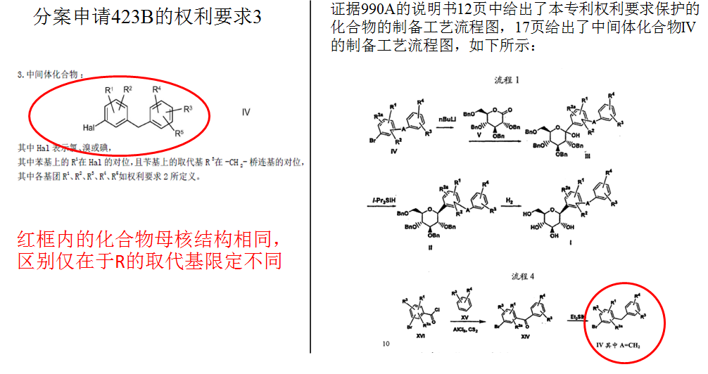 ?分案1:617A權(quán)1要求保護涵蓋恩格列凈在內(nèi)結(jié)構(gòu)通式化合物,涉及保護化合物范圍遠大于分案423B,從權(quán)2化學通用名形式具體保護16種化合物(包含恩格列凈);