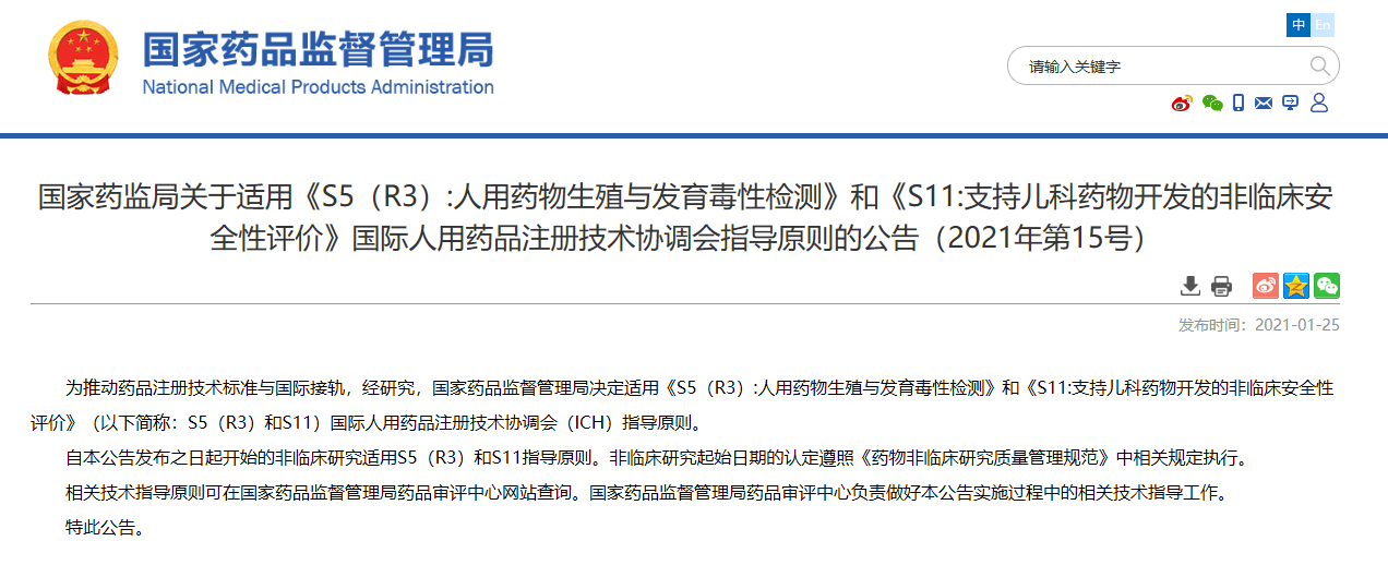 關(guān)于適用《S5(R3):人用藥物生殖與發(fā)育毒性檢測(cè)》和《S11:支持兒科藥物開(kāi)發(fā)的非臨床安全性評(píng)價(jià)》國(guó)際人用藥品注冊(cè)技術(shù)協(xié)調(diào)會(huì)指導(dǎo)原則的公告(2021年第15號(hào))