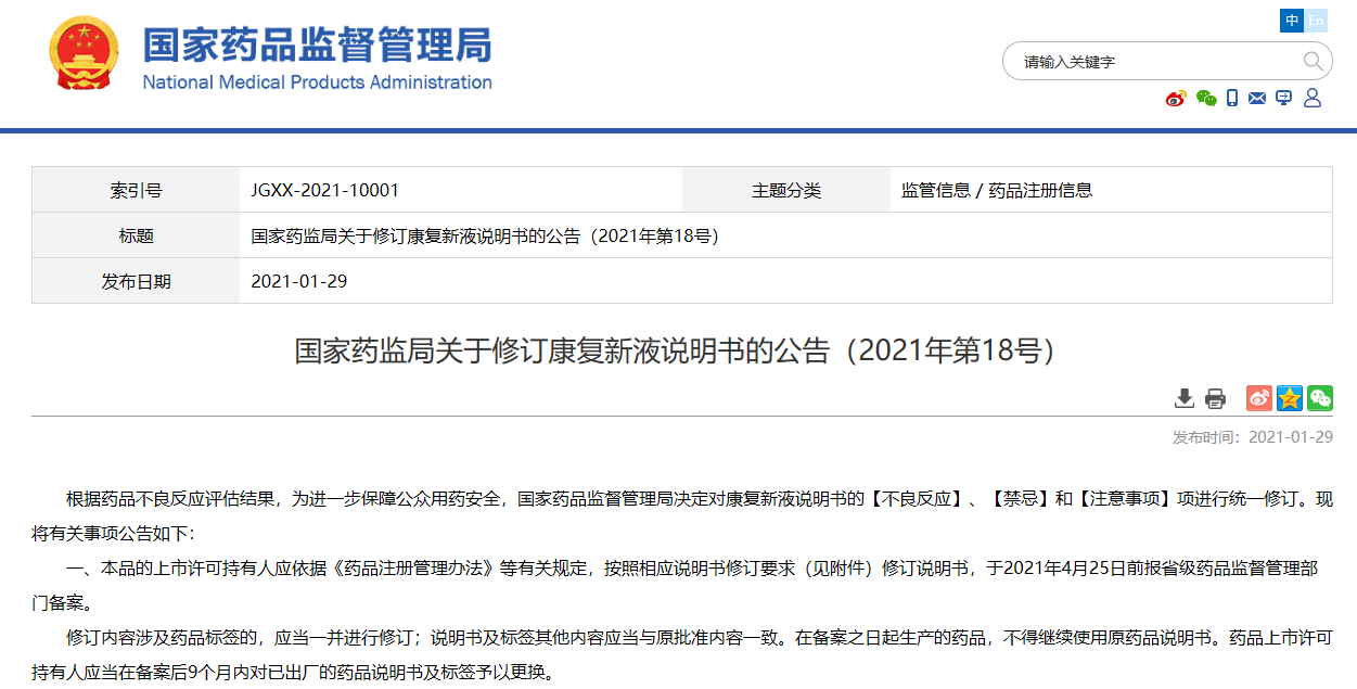 關(guān)于修訂康復(fù)新液說(shuō)明書(shū)的公告(2021年第18號(hào))