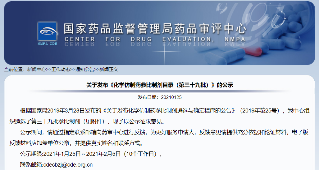關(guān)于發(fā)布《化學(xué)仿制藥參比制劑目錄(第三十九批)》的公示