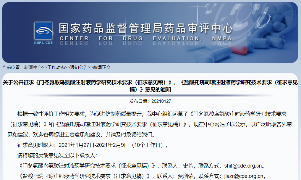 關(guān)于公開(kāi)征求《門(mén)冬氨酸鳥(niǎo)氨酸注射液藥學(xué)研究技術(shù)要求(征求意見(jiàn)稿)》、《鹽酸托烷司瓊注射液藥學(xué)研究技術(shù)要求(征求意見(jiàn)稿)》意見(jiàn)的通知