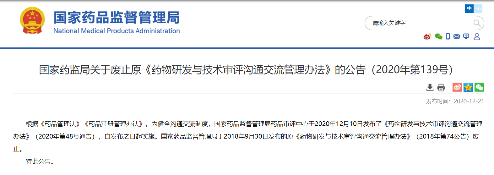 關(guān)于廢止原《藥物研發(fā)與技術(shù)審評(píng)溝通交流管理辦法》的公告(2020年第139號(hào))