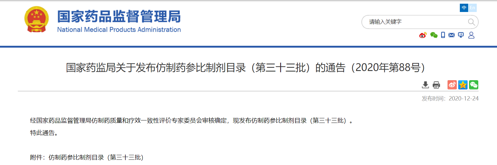 關(guān)于發(fā)布仿制藥參比制劑目錄(第三十三批)的通告(2020年第88號(hào))