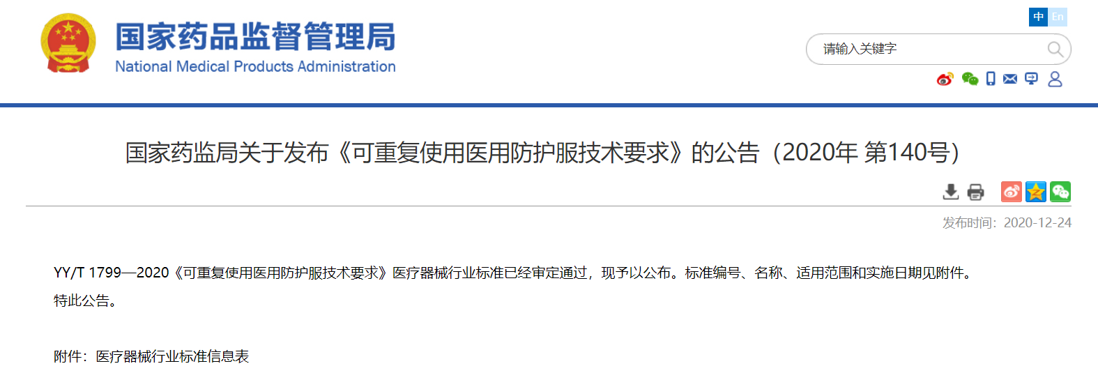 關(guān)于發(fā)布《可重復(fù)使用醫(yī)用防護(hù)服技術(shù)要求》的公告(2020年第140號(hào))