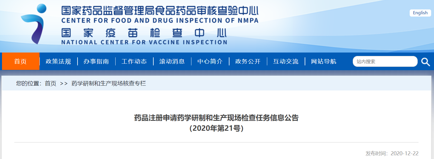 藥品注冊(cè)申請(qǐng)藥學(xué)研制和生產(chǎn)現(xiàn)場(chǎng)檢查任務(wù)信息公告(2020年第21號(hào))