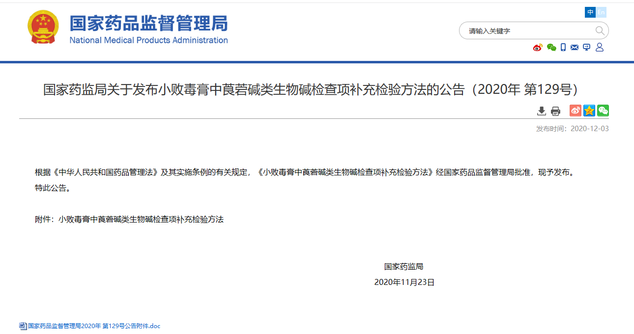 關(guān)于發(fā)布小敗毒膏中莨菪堿類生物堿檢查項(xiàng)補(bǔ)充檢驗(yàn)方法的公告(2020年 第129號)
