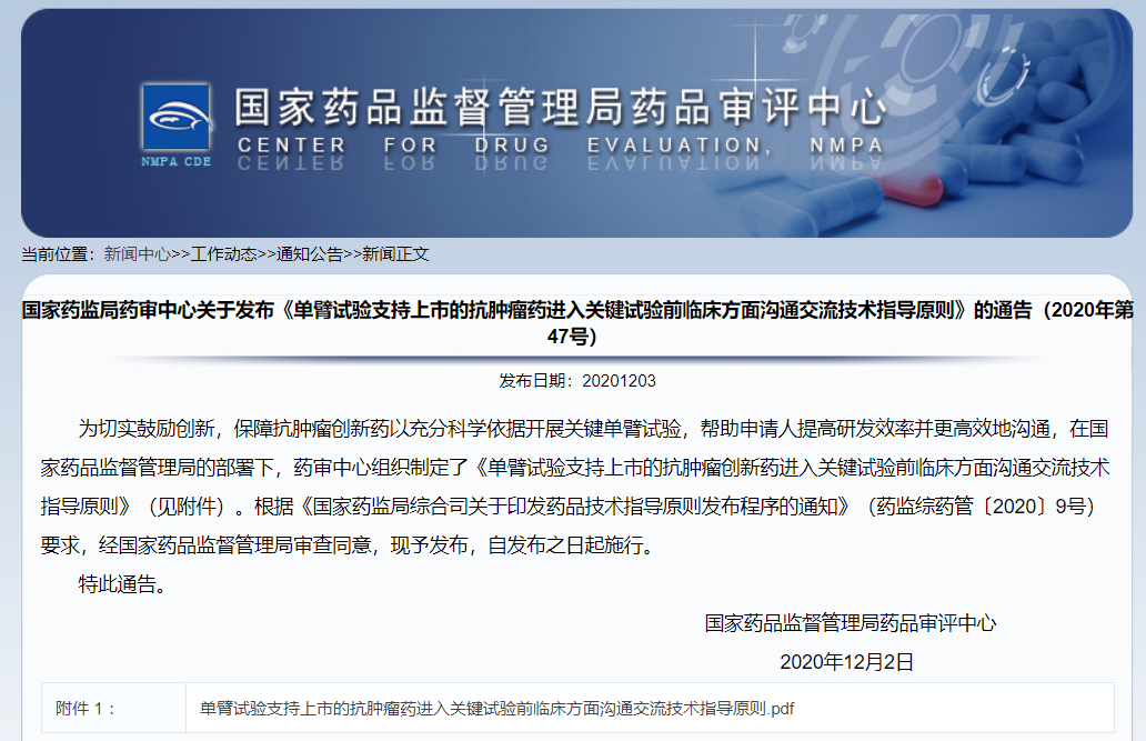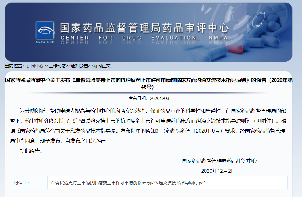 《單臂試驗(yàn)支持上市的抗腫瘤藥上市許可申請前臨床方面溝通交流技術(shù)指導(dǎo)原則》的通告(2020年第46號)