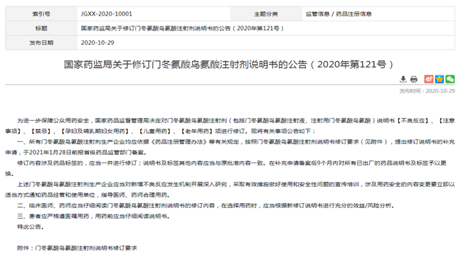 為進(jìn)一步保障公眾用藥安全,國(guó)家藥品監(jiān)督管理局決定對(duì)門(mén)冬氨酸鳥(niǎo)氨酸注射劑(包括門(mén)冬氨酸鳥(niǎo)氨酸注射液、注射用門(mén)冬氨酸鳥(niǎo)氨酸)說(shuō)明書(shū)項(xiàng)進(jìn)行修訂,各持有人須參照修訂要求,提出修訂說(shuō)明書(shū)的補(bǔ)充申請(qǐng),于2021年1月28日前報(bào)省級(jí)藥品監(jiān)管部門(mén)備案,并在補(bǔ)充申請(qǐng)備案后9個(gè)月內(nèi)對(duì)所有已出廠(chǎng)的藥品說(shuō)明書(shū)及標(biāo)簽予以更換。