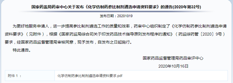 ?  國(guó)家藥監(jiān)局藥審中心關(guān)于發(fā)布《化學(xué)仿制藥參比制劑遴選申請(qǐng)資料要求》的通告(2020年第32號(hào))