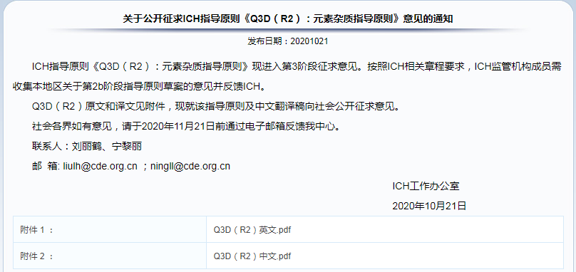 ?  關(guān)于公開(kāi)征求ICH指導(dǎo)原則《Q3D(R2):元素雜質(zhì)指導(dǎo)原則》意見(jiàn)的通知