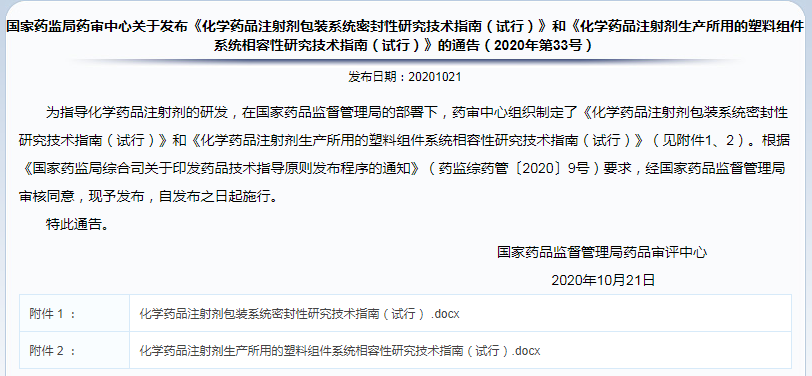 ?  國(guó)家藥監(jiān)局藥審中心關(guān)于發(fā)布《化學(xué)藥品注射劑包裝系統(tǒng)密封性研究技術(shù)指南(試行)》和《化學(xué)藥品注射劑生產(chǎn)所用的塑料組件系統(tǒng)相容性研究技術(shù)指南(試行)》的通告(2020年第33號(hào))