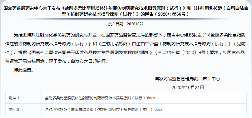 ?  國(guó)家藥監(jiān)局藥審中心關(guān)于發(fā)布《鹽酸多柔比星脂質(zhì)體注射液仿制藥研究技術(shù)指導(dǎo)原則(試行)》和《注射用紫杉醇(白蛋白結(jié)合型)仿制藥研究技術(shù)指導(dǎo)原則(試行)》的通告(2020年第36號(hào))