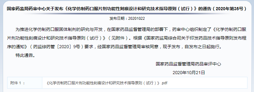 ?  國(guó)家藥監(jiān)局藥審中心關(guān)于發(fā)布《化學(xué)仿制藥口服片劑功能性刻痕設(shè)計(jì)和研究技術(shù)指導(dǎo)原則(試行)》的通告(2020年第35號(hào))
